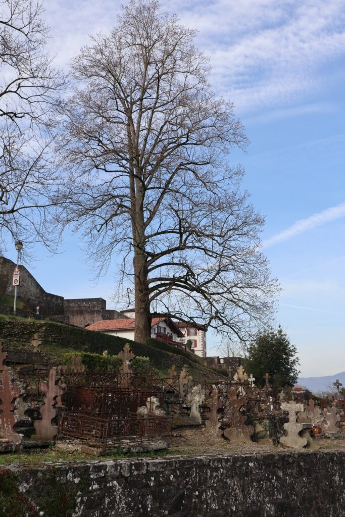 La variété des monuments, de l’urne pleine aux caveaux classiques, en passant par 38 croix métalliques, 53 enclos ou grilles de protection, les rosaces très élaborées et les arbres de vie, les si émouvantes tombes de nouveaux-nés (sur 52 enfants de 0 à 15 ans, 26 ont moins de deux ans), les trois sculptures de croix de la légion d’honneur, font partie des curiosités de notre vieux cimetière. Il frappe par la qualité et la diversité des sculptures sur ses 193 croix bas-navarraises souvent antérieures à 1850, aux volutes harmonieuses. Taillées pour beaucoup dans le grès rose si répandu en Garazi, elles sont parfois d’une taille inégalée. Les dalles —126 au total— portent souvent des textes sentimentaux, un phénomène unique en Iparralde. Seules manquent à l’appel les croix de bois, toutes disparues.