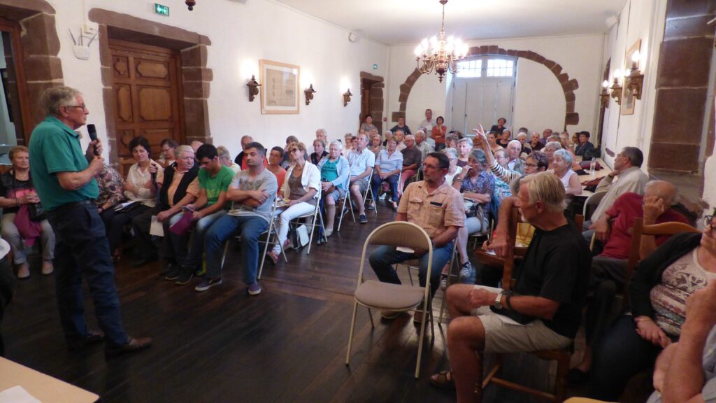 La conférence de Jean Moretti sur l’ activité industrielle de Mendive, de 1924 à 1956 a connu un vif succés, la salle s’étant avérée tout juste suffisante pour accueillir un nombreux public. Le conférencier a présenté et fait visionner un DVD très documenté qui retraçait l’épopée du câble d’Iraty et de la scierie qui lui était associée. Ce thème était évocateur pour une bonne partie de l’assistance, laquelle a manifesté son intérêt par son attention et de nombreuses questions. (Ce DVD peut être acquis auprès de l’association Oroimena, mémoire du câble d’Iraty – maison Etxeparea – RD18 – 64220 – Mendive).